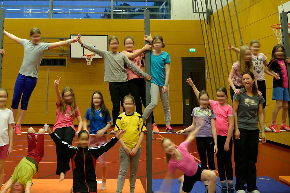 Wir probieren die verschiedensten Sachen aus, unter anderem Volleyball, Basketball, Fußball, Fangen, Völkerball, Sprintspiele, Staffelspiele, Seilspringen, Reifenspiele und vieles mehr. Beim Freiturnen kannst du Geräte selbstständig ausprobieren – wie cool ist das denn?!